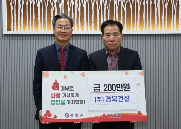 31일에는 (주)경북건설(대표 김경호)이 영양군을 방문해 어려운 이웃을 위한 성금 200만원을 전달했다. 김경호 대표는 “어렵고 힘든 시기일수록 함께 더 나누고 도울 수 있어야 한다고 생각해 나눔에 동참했다”며“어려운 이웃들을 위해 도움을 드릴 수 있어 기쁘다”라고 기부 소감을 전했다.