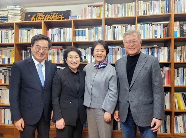 김 지사는 5일 부인 정우영 여사와 함께 경남 양산시 하북면 평산마을 문재인 전 대통령 사저를 찾아 문 전 대통령 내외와 차담을 했다.