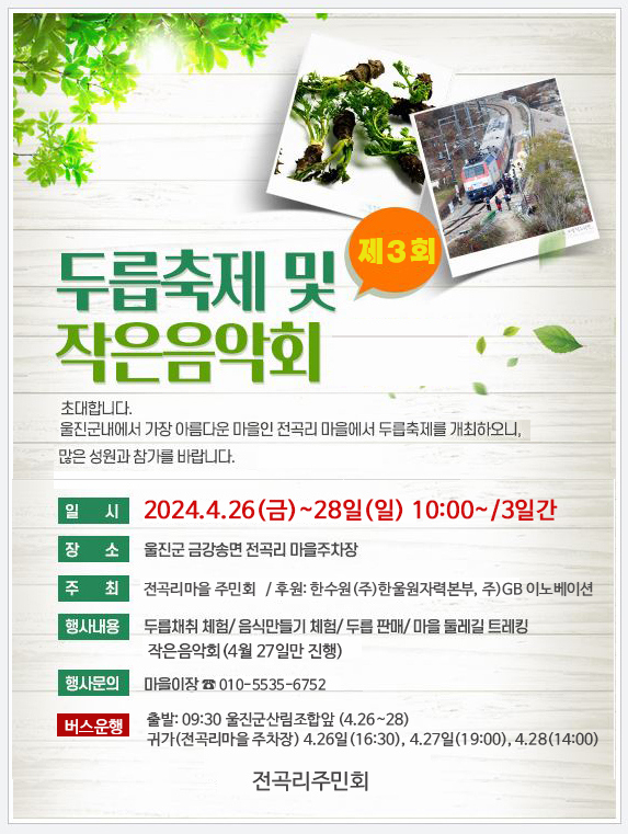 울진군산림조합 앞에서 오전 9시 30분에 출발하며 돌아오는 버스는 26일은 오후 4시 30분, 27일은 오후 7시, 그리고 28일은 오후 2시에 전곡리 마을 주차장에서 탑승하면 된다.