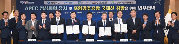 경상북도는 14일 도청 사림실에서 포항시, 경주시, 한국공항공사 포항경주공항, 경상북도문화관광공사와 함께 2025 APEC 경주 유치 지원과 포항경주공항 국제선 부정기편 운항을 위한 업무협약을 체결했다.