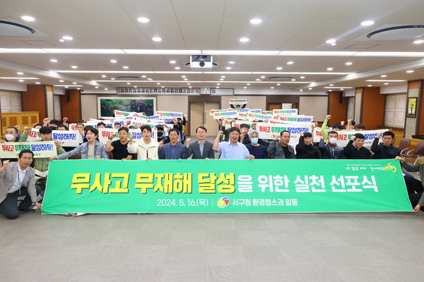 이날 서구청 환경청소과 직원들은 '무재해 무사고 달성하자'의 구호를 외치고 안전을 먼저 생각하고 예방, 노력하기 위한 안전의식을 다지는 ‘무사고·무재해 달성을 위한 실천 선포식’을 진행했다.