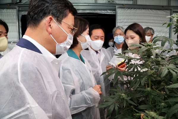 | ▲ 김형동 의원(좌측)과 권기창 시장(좌측 세번째)이 햄프 연구시설을 둘러보며 설명을 듣고 있다. 안동시 제공 | ||