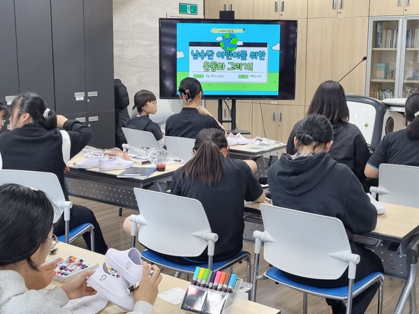 탑리여자중학교 전교생은 도서관에 모여 아프리카 최빈국인 남수단에서 신발도 없이 노동 현장에 뛰어든 아이들을 돕고자 학교에서 진행하는 운동화 그리기 봉사활동에 참여하였다.