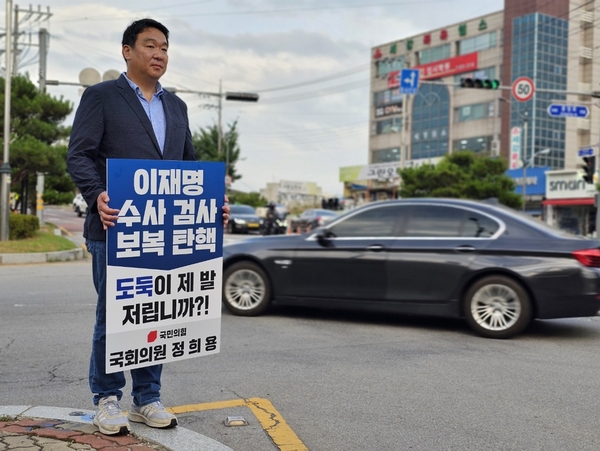 정희용 의원은 지난 6일 칠곡군 왜관읍 로얄사거리에서 1인 피켓 시위를 펼치면서 지난 2일 민주당 의원들이 이재명 전 대표 사건 등을 수사했던 검사들에 대해 탄핵 소추안을 제출한 것을 강력히 규탄하고, 삼권분립을 위반하는 위헌적 입법 행위와 근거 없는 탄핵 추진으로 사법부를 장악하려는 시도를 즉각 멈출 것을 강조했다.
