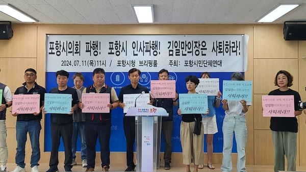 포항시민단체연대회의는 11일 오전 시청에서 기자회견을 열고 “김일만 신임 포항시의회 의장의 독단적이고 독선적인 파행 운영으로 민의의 산실인 시의회의 풀뿌리 민주주의가 심각하게 훼손되고, 인사 파행으로 인한 시정까지 혼란을 겪고 있다”며 김일만 의장의 자진사퇴를 요구했다.