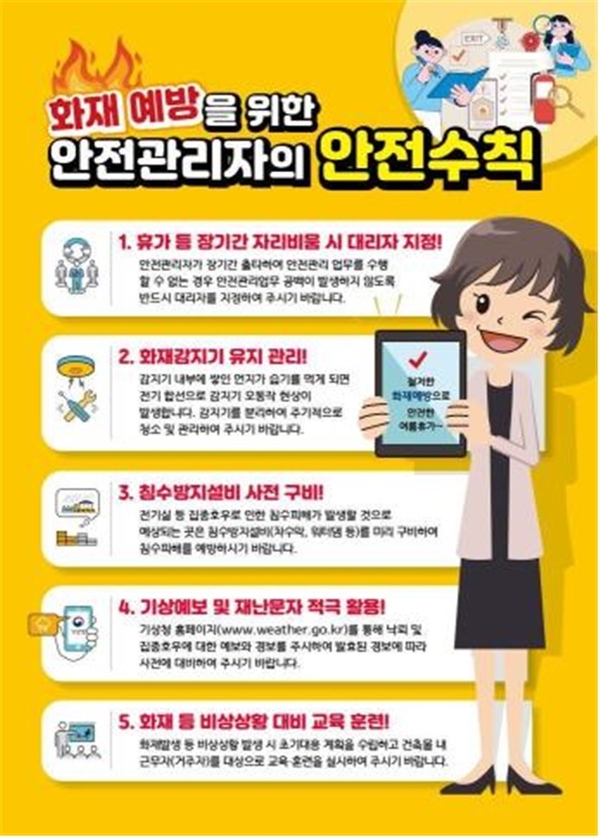 주요 안전수칙으로는 △주거공간이나 상업 시설 등에 휴가나 장기간 자리를 비울 때 대리자를 지정해 잠재적 화재 상황 대비 △화재감지기 유지 관리를 위해 정기적으로 작동상태 확인 등 유지보수 작업을 시행 △전기실 등 집중호우가 예상되는 곳은 침수방지설비 사전 구비 △주기적으로 기상예보와 재난 문자 확인 △화재 등 비상상황에 대비해 초기 대응계획을 수립 하는 등 지속적인 교육 등을 강조했다.