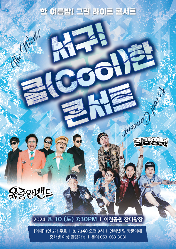 서구문화회관은 무더위와 열대야로 지쳐있는 주민들에게 이현공원의 시원한 잔디광장에서 편안한 휴식과 경쾌하고 신나는 음악을 선사하고자‘서구! 쿨(Cool)한 콘서트’를 개최한다.