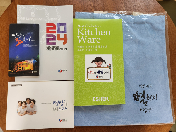 영양 웰컴꾸러미는 영양관광홍보책자, 영양군이 추진하고 있는 인구정책, 우리소식지 등 새로운 환경에서 필요한 생활 및 정책정보 자료등을 웰컴키트와 함께 에코백에 담아 구성했다.