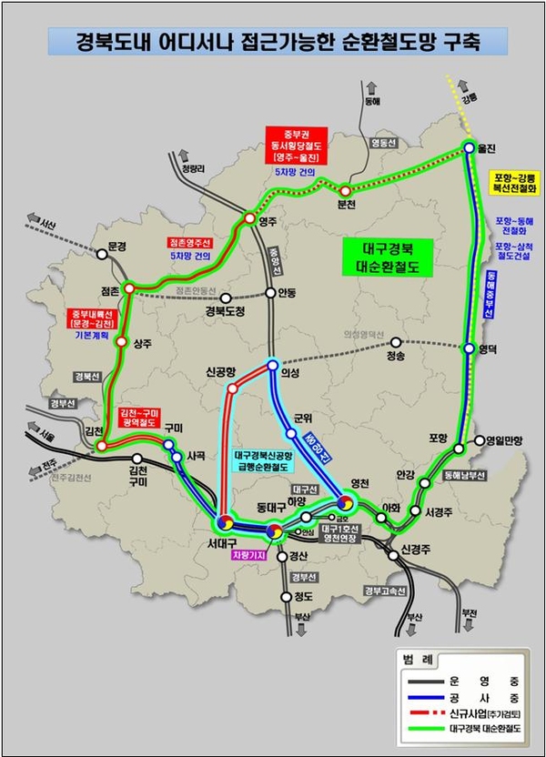 이를 위해 먼저 경북도는 대구경북 메가시티의 핵심 교통인프라 사업으로 추진하는 TK 신공항 광역철도와 연계해 기존노선인 중앙선(의성~영천), 대구선(영천~동대구)을 활용한 대구경북신공항 급행순환철도망을 구축할 계획이다.
