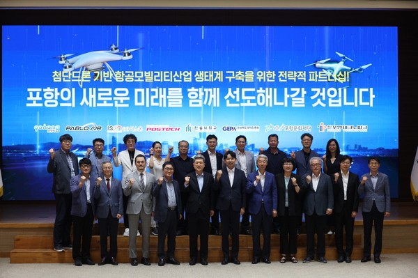 포항시는 28일 시청 대회의실에서 드론기업체 대표, 지역대학, 유관기관 등이 참여한 가운데 첨단드론 기반 항공모빌리티 산업 육성 및 혁신생태계 조성을 위한 상호협력 업무협약을 체결했다.