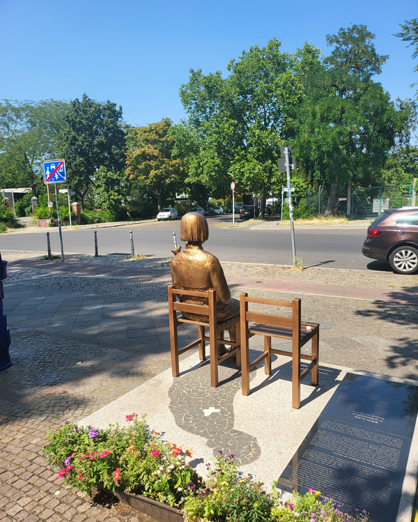 지하철역에서 5분 쯤 가자 2020년 9월 베를린에 있는 한인 및 독일시민단체 ‘코리아협의회’의 주도로 건립한 평화의 소녀상이 미테구의 작은 공원 앞에 세워져 있었다, 치마저고리를 입은 단발머리의 작은 소녀가 맨발로 의자에 앉아 주먹 쥔 손을 무릎에 올린 채 하염없이 어딘가를 바라보고 있다. 왼쪽 어깨엔 비둘기까지 올려놓았다.