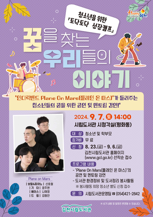 또한 9월 7일에는 청소년과 학부모를 위한 '토닥토닥 성장캠프'가 시립도서관 본관 시청각실에서 열린다. 인디락밴드 플레인 온 마스가 청소년의 진로 탐색을 위한 공연과 멘토링 강연을 한다. 현재 시립도서관 홈페이지에서 선착순 참가 신청을 신청받고 있다.