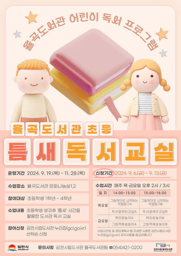 '초등 틈새 독서 교실'도 9월 19일부터 율곡도서관에서 시범 운영을 시작한다. 초등 틈새 독서 교실은 초등 저학년(1~4학년)을 대상으로 방과 후 틈새 시간에 독서 클레이, 그림책으로 시작하는 직업 탐구 등 학습과 흥미가 조합된 독서 연계 프로그램에 참여함으로써 학생들이 도서관을 자주 방문하고 책과 친숙해질 수 있는 계기를 만들기 위해 기획된 프로그램이다. 9월 6일부터 김천시립도서관 홈페이지에서 참가 신청을 할 수 있다.