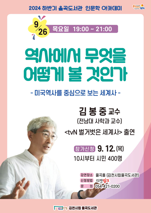 9월 26일에는 율곡도서관에서 벌거벗은 세계사에 출연한 전남대 김봉중 교수가 '역사에서 무엇을 어떻게 볼 것인가'라는 주제로 미국 역사와 미국 역사가 세계사에 미친 영향에 대해 알아보는 인문학 아카데미가 개최되며 참가 신청은 9월 12일부터 티켓링크를 통해 할 수 있다.