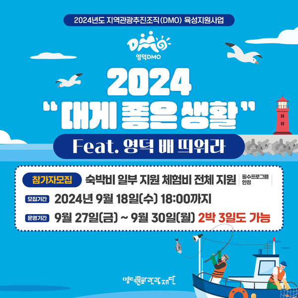 선착순 마감인 ‘대게좋은생활_영덕 배 띄워라’ 프로그램에 대한 자세한 내용은 영덕문화관광재단 홈페이지(https://ydct.org/)에서 확인할 수 있고 재단 관광마케팅팀(054-730-5853)으로도 문의 가능하다.