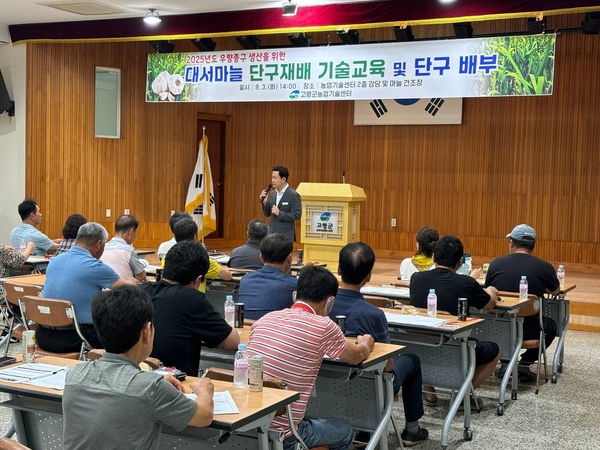해당 교육은 6월에 수확한 단구를 건조·선별해 이를 내년도 씨마늘로 생산하기 위해 모집한 증식농가를 대상으로 진행했으며, 대서마늘 단구재배 기술교육을 통해 무병 우량종구 생산 및 보급, 그리고 생산량 증가와 대내외 농업 경쟁력 강화를 도모하고자 추진됐다.
