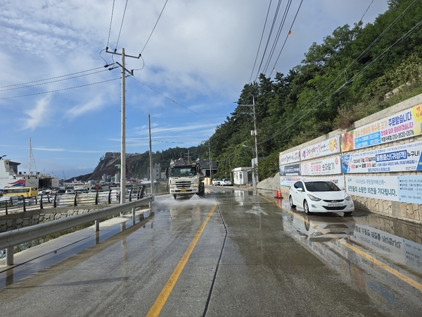 | ▲군이 살수차량 동원해 일주도로를 청소하고있다.김문도 기자 | ||