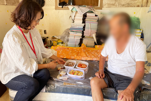 ▲ 맞춤형 복지팀이 취약 계층 가구에 명절 음식을 전달한 후 담소를 나누고 있다. 청송군 제공