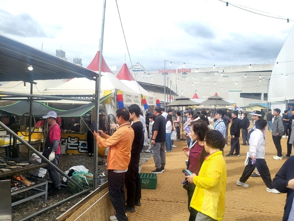 | ▲ 간고등어김밥, 염통구이, 고사리전, 북은나물전집은 물론 36개 부스 대부분 넘쳐나는 손님들로 장사진을 치고 있는 모습이다. 황해득 기자 | ||