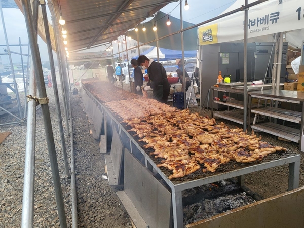 | ▲ 공장을 방불케 하는 닭바베큐존에 수백마리 통닭을 동시에 조리하는 직원의 손놀림이 바쁘다. 황해득 기자 | ||