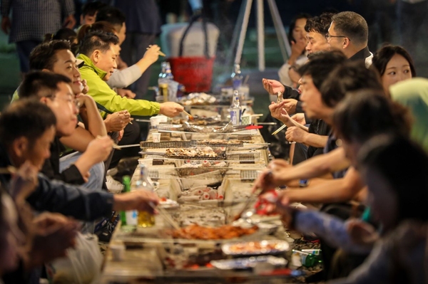 | ▲ 철길을 걷어낸 침목을 재활용해 길게 깔아 만든 구이터에도 늦은 밤까지 관광객들의 웃음꽃이 끊이지 않는다. 안동시 제공 | ||