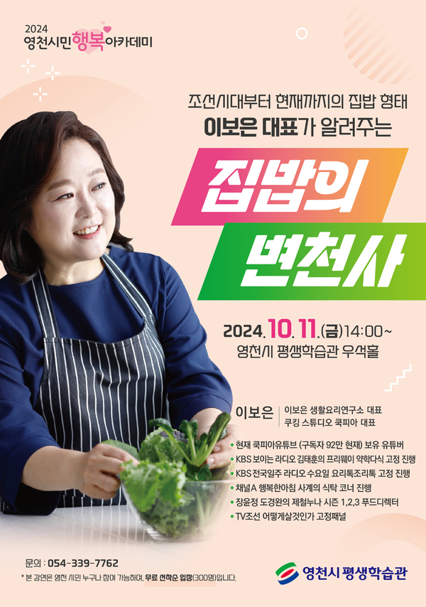 이번 특강은 전석 무료로 진행되며 자유 좌석제로 사전 신청없이 영천시민이면 누구나 참석이 가능하다. 자세한 내용은 평생학습관 교육운영담당(054-339-7762)으로 문의하면 안내 받을 수 있다.
