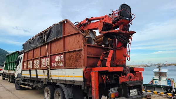 | ▲지역 폐기물 업체 차량에 실려있는 가두리양식장 자재들이 반출직전 사동항 대기중인 모습. 김문도 기자 | ||