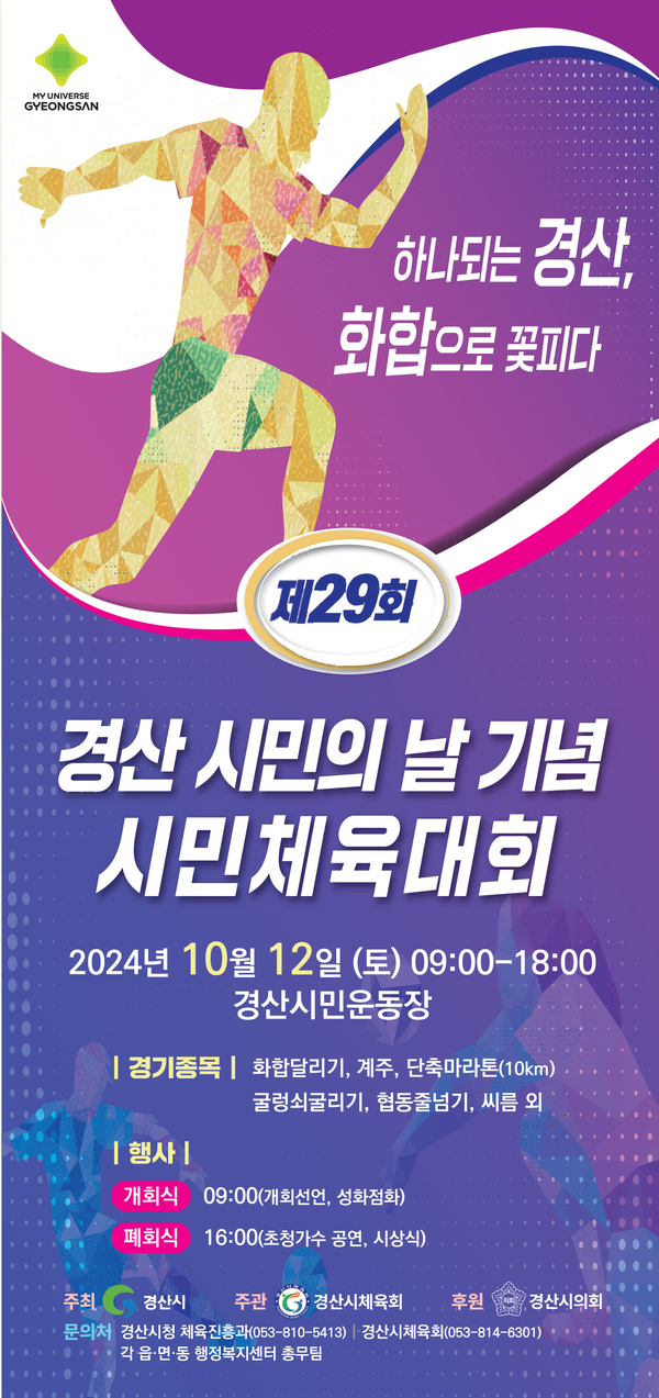 조현일 경산시장은 “이번 대회가 28만 경산시민이 하나 되는 소통과 화합의 자리가 되길 바란다”며 “경산시의 발전을 대내외에 알리고 앞으로의 더 큰 도약을 다짐하는 축제의 장이 되도록 하겠다”고 말했다.