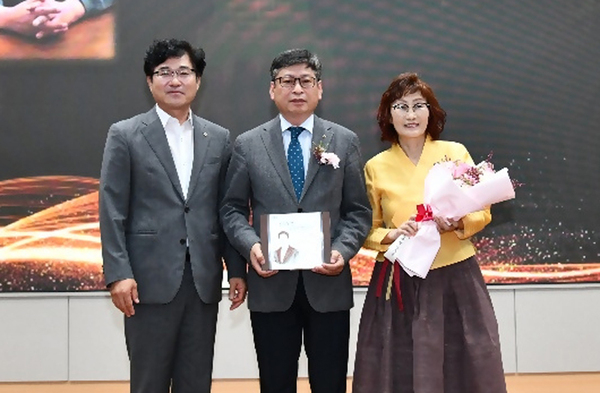 | ▲ 정종학(가운데) 울릉농협장이 10일 농협중앙회 경북지역본부에서 열린 10월 정례조회에서 “경북농협 으뜸 조합장상‘을 수상한후 부인과 함께 기념사진을 찍고 있다. 울릉농협 제공 | ||