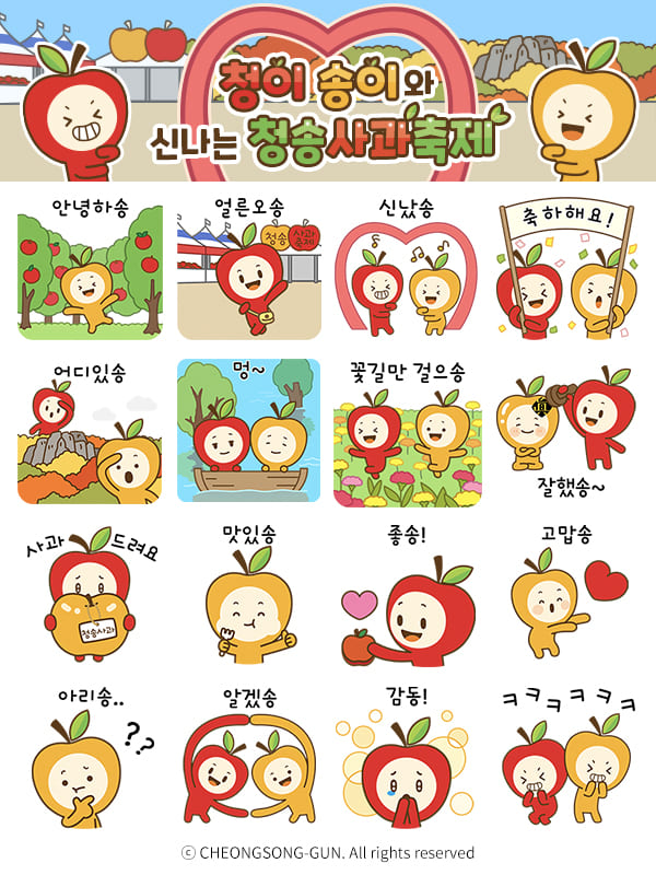 이번 이모티콘은 10월 30일부터 5일간 개최되는 ‘제18회 청송사과축제’를 맞아 제작하였으며,