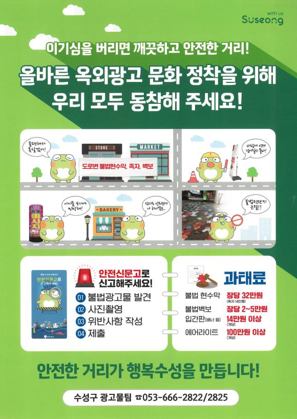 대구 수성구는 안전하고 깨끗한 도시 수성구를 만들기 위해 수성구 대표 캐릭터인 ‘뚜비’를 활용한 불법광고물 예방 활동에 나선다고 30일 밝혔다.