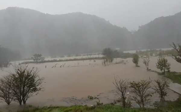 | ▲ 지난 2019년 태풍‘미탁’ 490mm 폭우에 침수 되어있는 나리분지 마을모습.김문도기자 | ||
