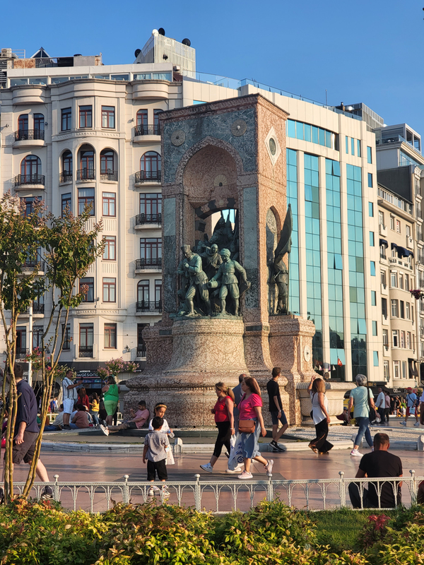 광장 중앙에는 터키 공화국의 독립을 상징하는 공화국 기념비가 서 있다. 이 기념비는 무스타파 케말 아타튀르크와 동지들이 군복 차림으로 서 있는 모습을 묘사하고 있다. 주변에는 터키의 국기 알 바이라크(Al Bayrak, 붉은 깃발)가 휘날리고 있다.