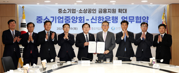중소기업중앙회는 19일 여의도 중기중앙회에서 신한은행과 중소기업·소상공인 금융지원 확대를 위한 업무협약을 체결했다.