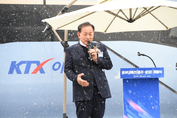| ▲ 신현국 문경시장이 중부내륙철도 개통식에서 인사말을 하고 있다. 문경시 제공 | ||