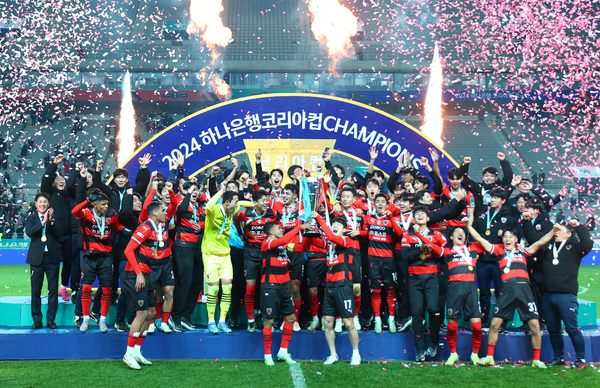 포항은 지난달 30일 오후 3시 서울월드컵경기장에서 열린 2024 하나은행 코리아컵 결승전 울산 HD와의 경기에서 후반 24분 터진 정재희의 동점골에 이은 1대1 균형을 이룬 가운데 펼쳐진 연장전에서 김인성의 결승골과 강현제의 쐐기골에 힘입어 3대1로 울산을 꺾고 코리아컵 정상에 올랐다.