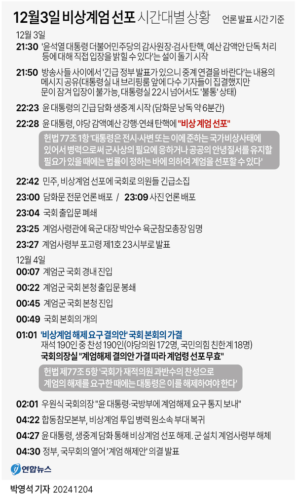 윤석열 대통령이 지난 3일 밤 느닷없이 '비상계엄'을 전격 선포하고 4일 새벽 국회의 계엄해제 요구안 결의를 받아들여 해제 입장을 밝히기까지 걸린 시간은 불과 6시간이었다.