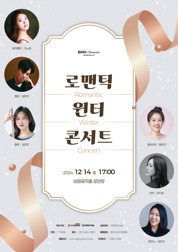 비원뮤직홀이 다가오는 오는 14일 겨울 시즌에 맞춰 '로맨틱 윈터 콘서트'를 선보일 예정이다. BMH Romantic 시리즈의 일환으로 준비된 이번 콘서트는 낭만과 사랑을 주제로 해 가족, 연인들이 함께 즐길 수 있는 무대로 꾸며진다. 이번 공연은 특별히 크리스마스 시즌을 맞아 지역민들에게 따뜻한 선물처럼 다가갈 예정이다.