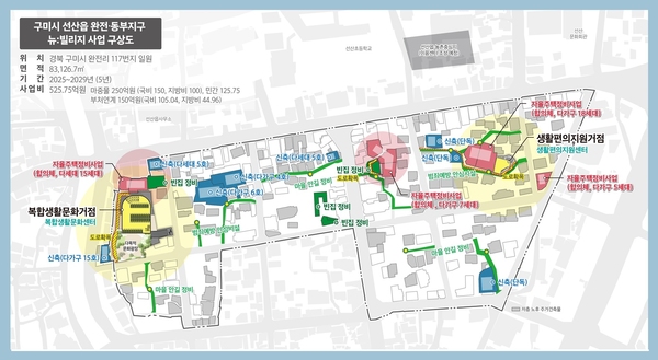 구미시 선산읍 완전·동부지구가 지난 23일 국토교통부가 주관하는 '2024년 뉴:빌리지 공모사업'에 최종 선정됐다. 이번 사업은 완전리와 동부리 일대 약 8만3126㎡를 대상으로 총사업비 250억원(국비 150억원, 도비 25억원, 시비 75억원)을 투입해 내년부터 2029년까지 5년간 추진된다. 목표는 지역 정주환경 개선과 민간 주택 정비 활성화다.