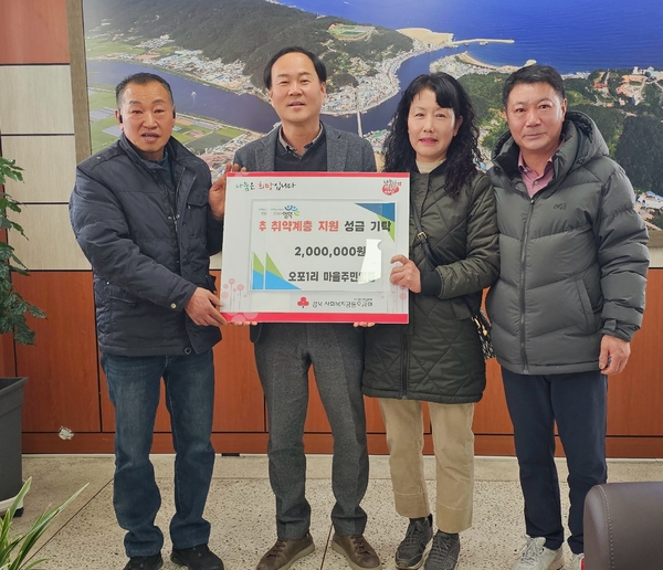 남희동 강구면장은 “모두가 어려운 시기이지만 이웃을 사랑하는 배려와 나눔의 힘으로 함께 극복할 수 있음을 주민들께서 보여주시고 있다”며, “주민들의 소중한 성금이 지역사회가 더 나은 공동체로 나아가는 힘이 될 수 있을 것이라 기대한다”고 고마움을 전했다.