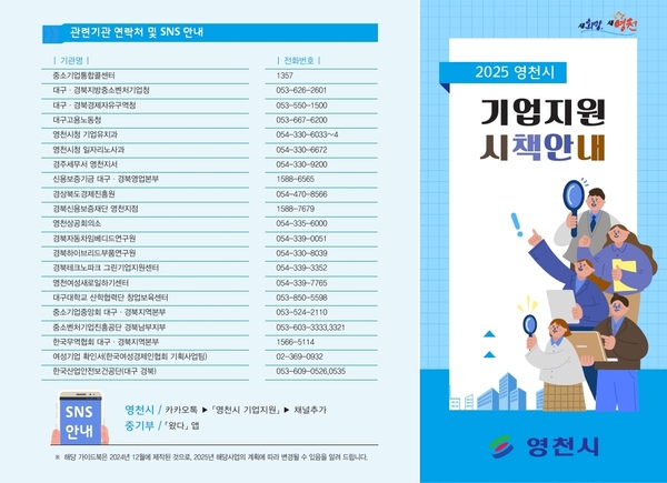영천시 관계자는 “시에서 제공하는 다양한 기업지원 정책들이 있지만, 정보를 알지 못해 신청을 놓치거나 지원받지 못하는 일이 없도록 기업지원 시책안내 가이드북을 매년 발간하고 있다”며, “가이드북를 활용해 기존 기업체 뿐만 아니라 영세 기업체들도 편리하게 빠르게 정보를 알고 적극적으로 활용하길 바란다”고 말했다.
