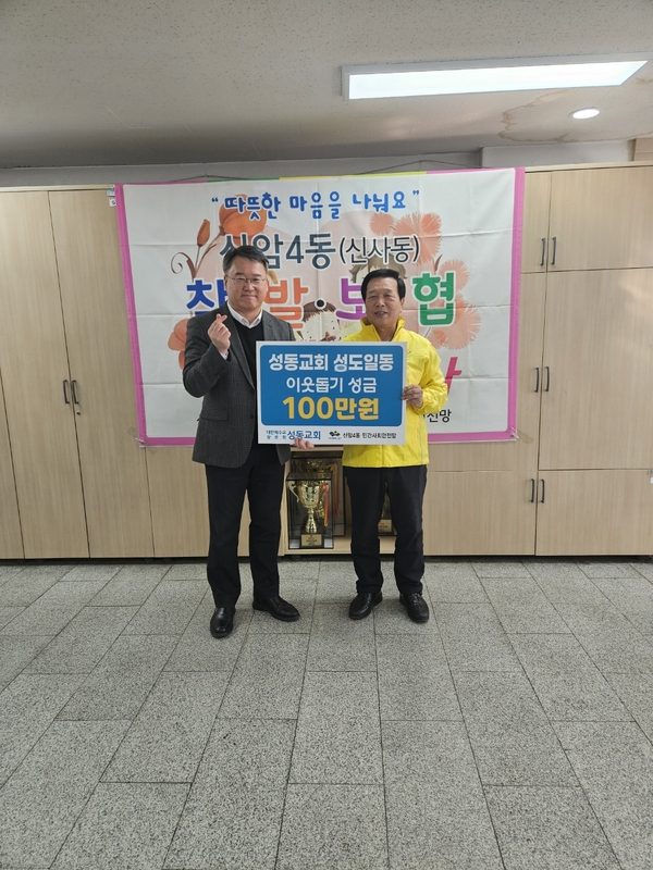 대구 동구 신암동 소재 성동교회 성도 일동은 지난 16일 이웃돕기성금 100만원을 신암4동 행정복지센터에 기탁했다.