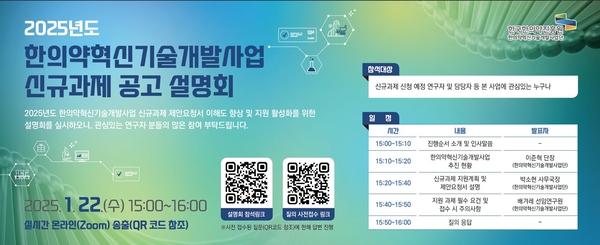 한국한의약진흥원 한의약혁신기술개발사업단은 지원 예정 연구자들의 이해를 돕기 위해 22일 오후 3시부터 온라인 설명회를 개최한다. 설명회에서는 △한의약혁신기술개발사업 추진 현황 △신규과제 지원계획 및 제안요청서 설명 △지원과제 필수 요건 및 접수 시 주의사항 등에 대해 상세하게 안내할 예정이다.
