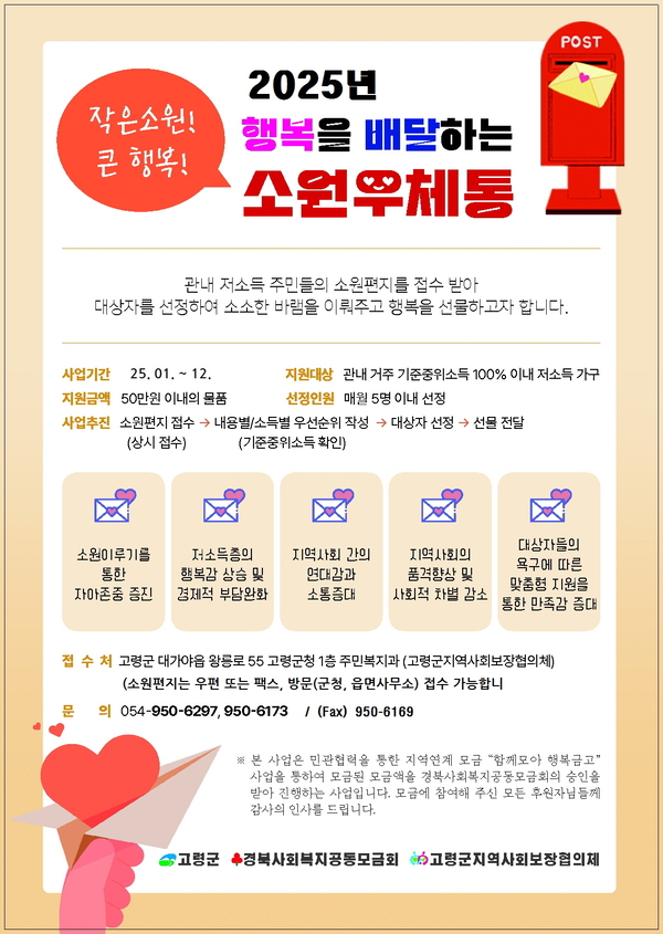 '소원우체통' 접수는 군청 주민복지과 내 비치된 접수함 또는 우편,팩스 등 다양한 방법으로 접수 가능하며, 문의 사항은 지역사회보장협의체(054-950-6297), 주민복지과(054-950-6173) 또는 읍면 맞춤형복지팀으로 문의하면 된다.