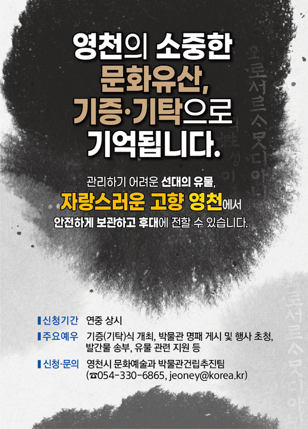 영천시립박물관은 작년 6월부터 화룡동 134번지 일원에 착공해 건립 중이다. 유물 기증·기탁에 대해 궁금하거나 관심 있다면 영천시 문화예술과 박물관건립추진팀(054-330-6865)으로 문의하면 된다.