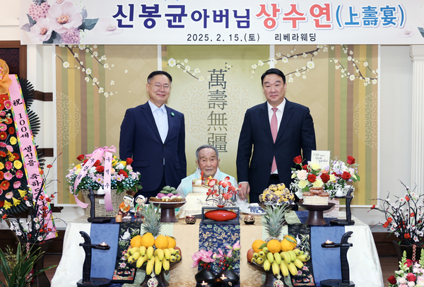 칠곡군은 기산면에 거주하는 신봉균 어르신의 백수연이 지난 15일 왜관읍 리베라 웨딩홀에서 열렸다고 17일 밝혔다. 이날 백수연에는 김재욱 칠곡군수, 정희용 국회의원, 가족, 주민 등 150여명이 참석해 어르신의 헌신을 기리고 장수를 축하했다. 6·25 전쟁 당시 194만여 명이 참전했지만, 현재 생존자는 3만 2000여 명에 불과하다. 이날 잔치는 단순한 축하를 넘어, 대한민국을 위해 헌신한 한 영웅을 향한 깊은 감사와 존경의 자리였다.