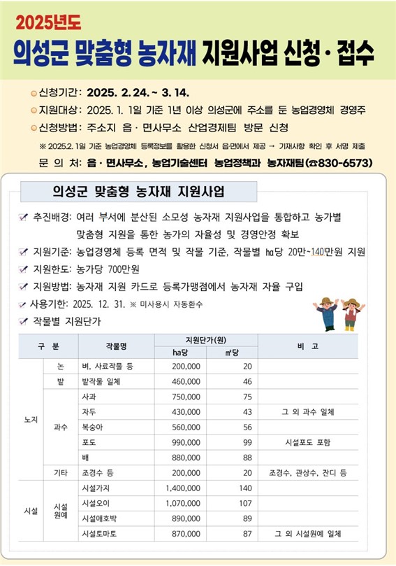 지원 대상은 2025년 1월 1일 기준으로 1년 이상 의성군에 주소를 둔 농업경영체 경영주이다. 신청은 주소지 읍·면사무소에서 할 수 있으며 지원기준은 농업경영체에 등록된 면적 및 작물을 기준으로 ha당 20만원에서 140만원까지 지원된다. 농가당 최대 지원한도는 700만원이다.