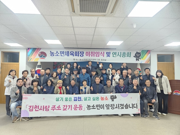 ▲ 농소면 체육회장 이취임식에서 참석자들이 기념촬영을 하고 있다. 김천시 제공 김천시 농소면 체육회는 지난 27일 농소면 체육회장 이취임식 및 연시총회를 개최했다. 이날 신임회장으로 선출된 박인수 회장은 "지난 시간 농소면 발전과 화합을 위해 애쓰신 김옥겸 회장님에게 감사드리며, 전임 회장님과 임원진들이 이룬 성과에 누가 되지 않도록 농소면 발전을 위해 최선을 다해 봉사하겠다"며 취임 인사를 했다. 박근옥 면장은 "새로 취임하신 박인수 회장님께서 농소면 화합을 위해 더욱 큰 역할을 해 주실 것으로 믿으며, 면 행정복지센터에서도 체육회와 발맞추어 농소면 발전을 위해 최선을 다하겠다"고 축하 인사를 전했다.