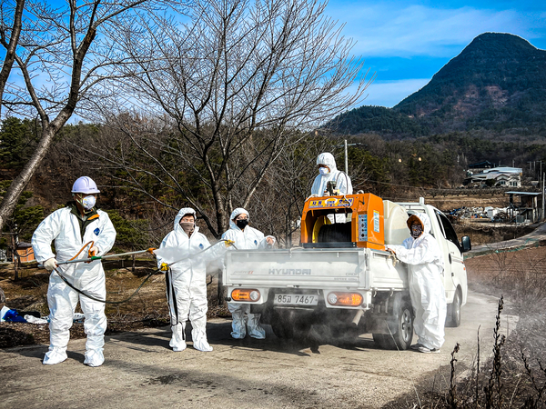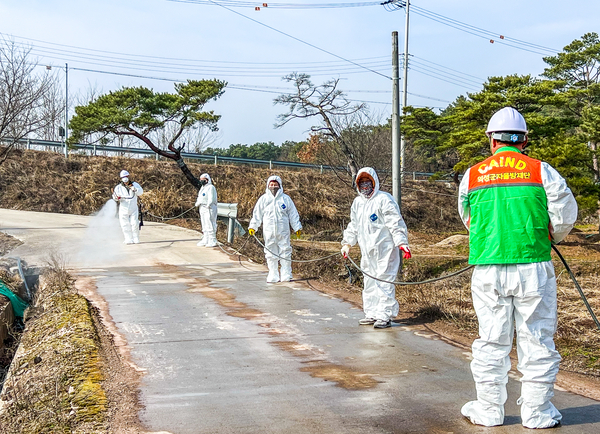 | ▲ 관계자들이 아프리카돼지열병(ASF) 바이러스 대응을 위해 농가입구와 도로에 일제 소독을 하고있다 | ||