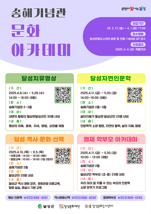 이번 프로그램은 달성군민을 대상으로 운영되며, 오는 4월 1일까지 교육생을 모집한다. 신청은 달성문화도시센터 문화도시사업팀에 방문하거나 전화(053-668-4261~3)접수 또는 해당 사업별 네이버 폼을 이용하면 된다. 사업과 관련한 자세한 내용은 달성문화재단 홈페이지(www.dsart.or.kr)에서 확인할 수 있다.
